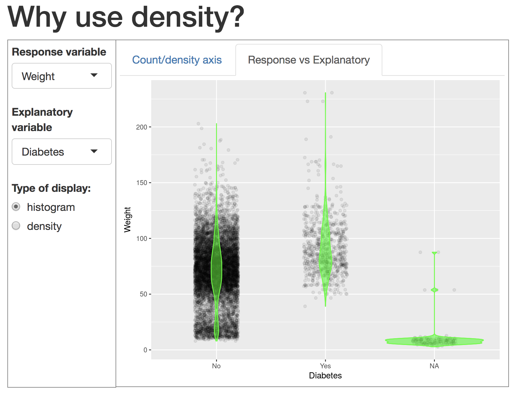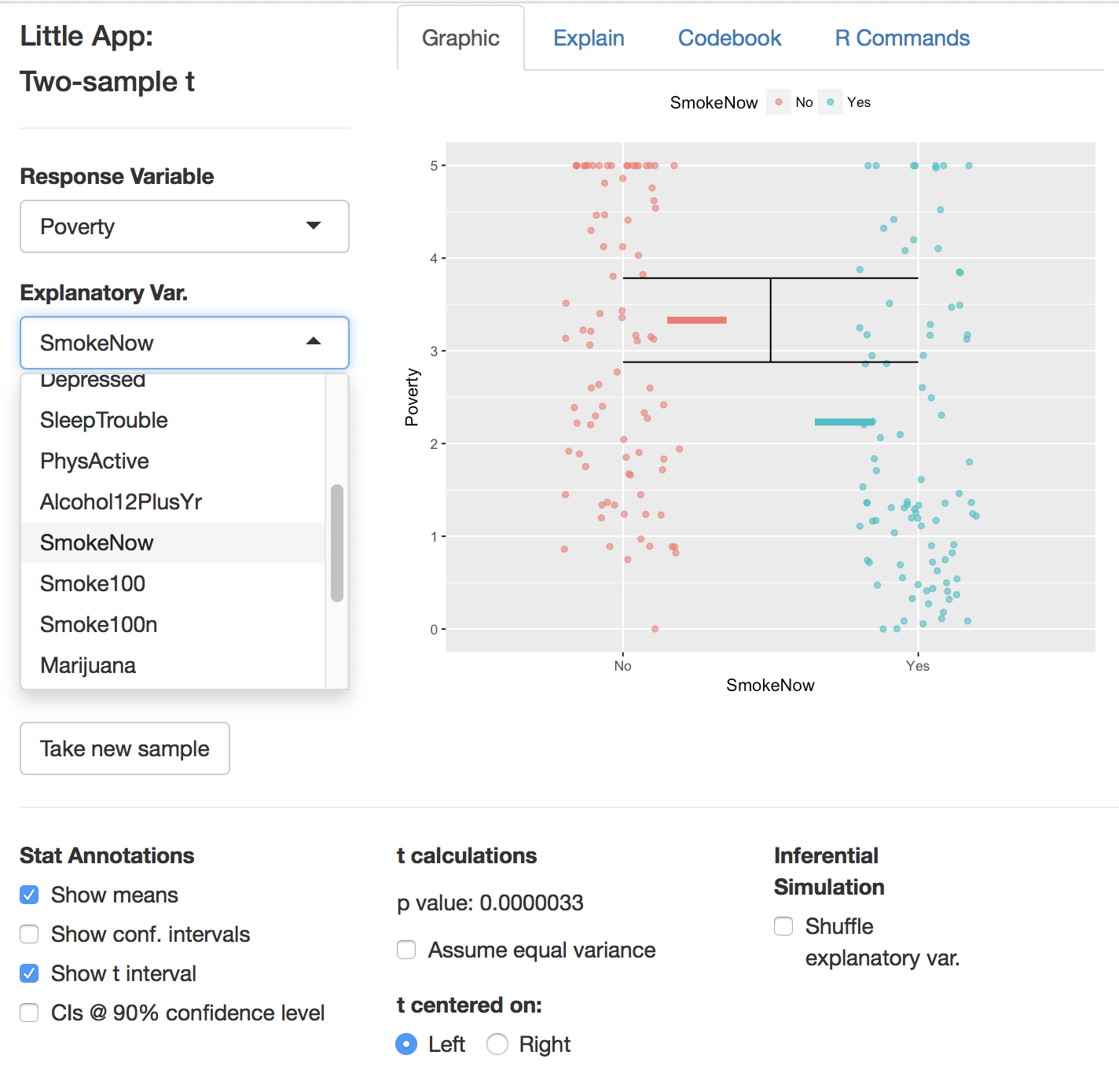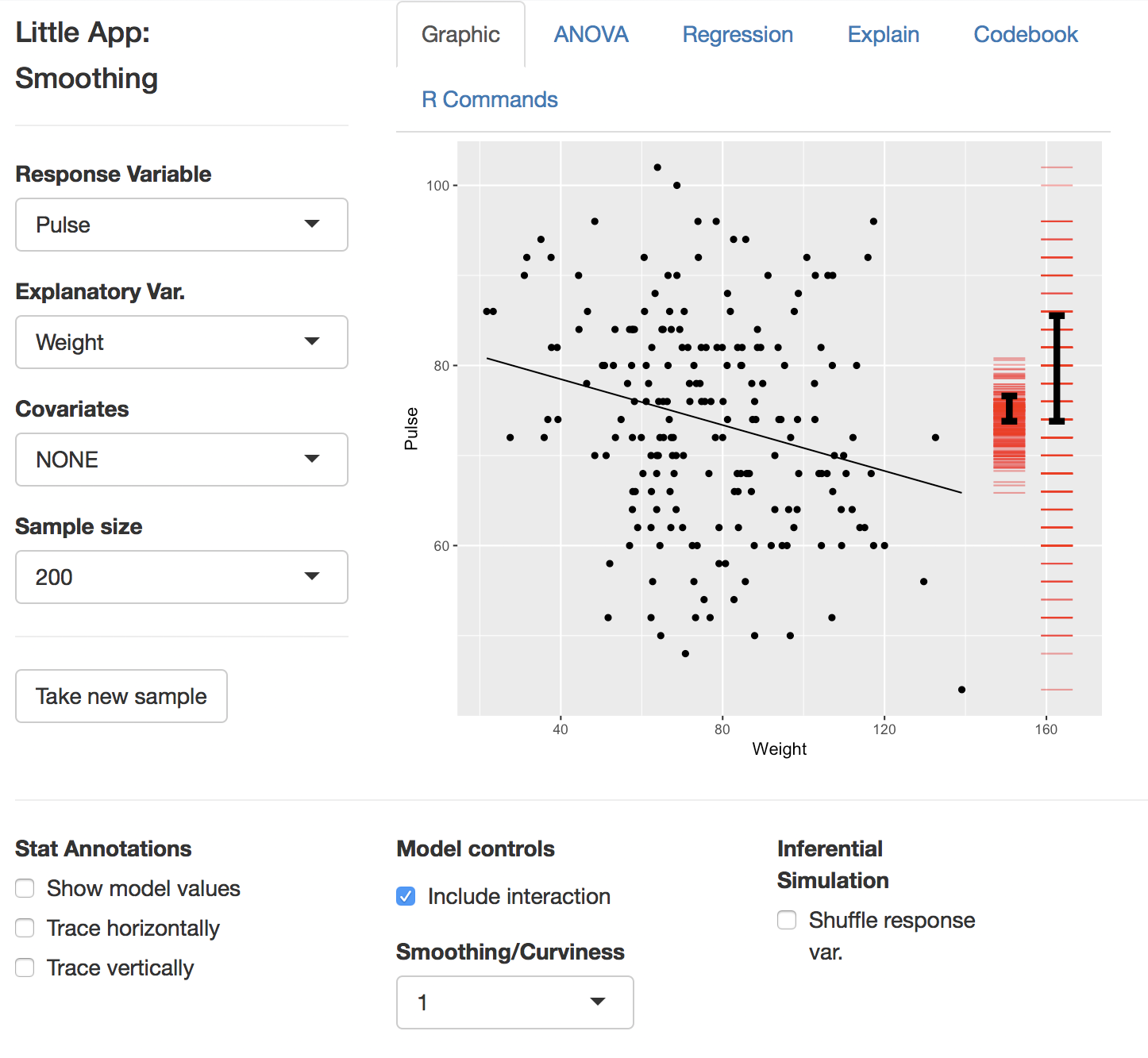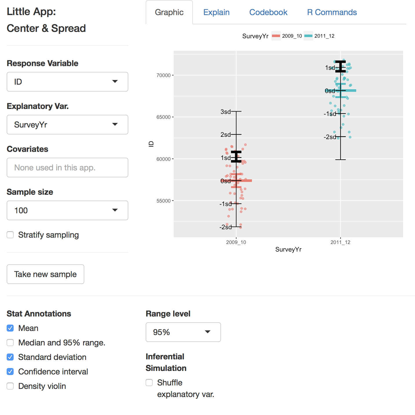 Feedback on the original Little Apps has prompted us to revise them, adding features such as tabs for the codebook, an explanation, and R code in the app itself. The following Little Apps have not yet been revised, but will be this summer. Still, the main ideas are present in the original version.